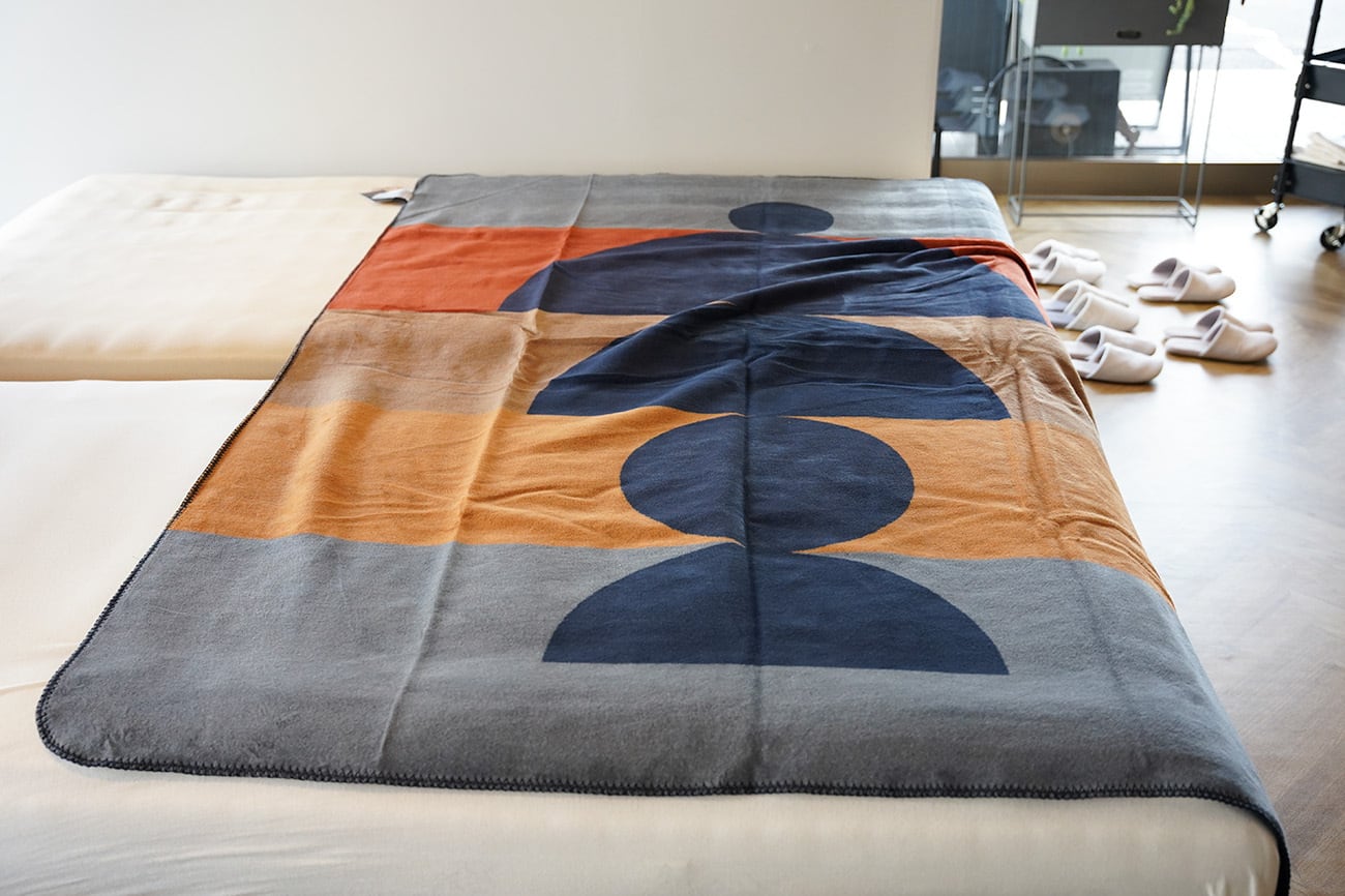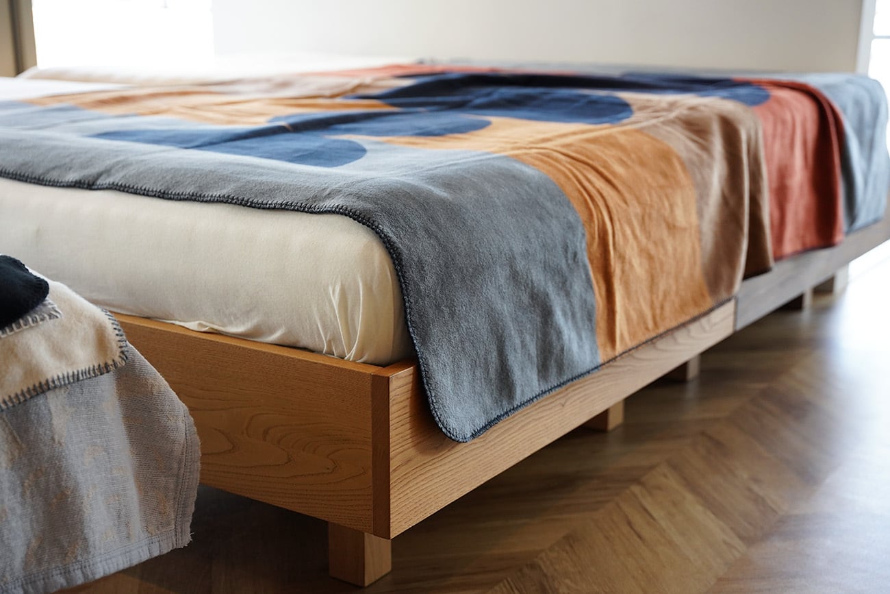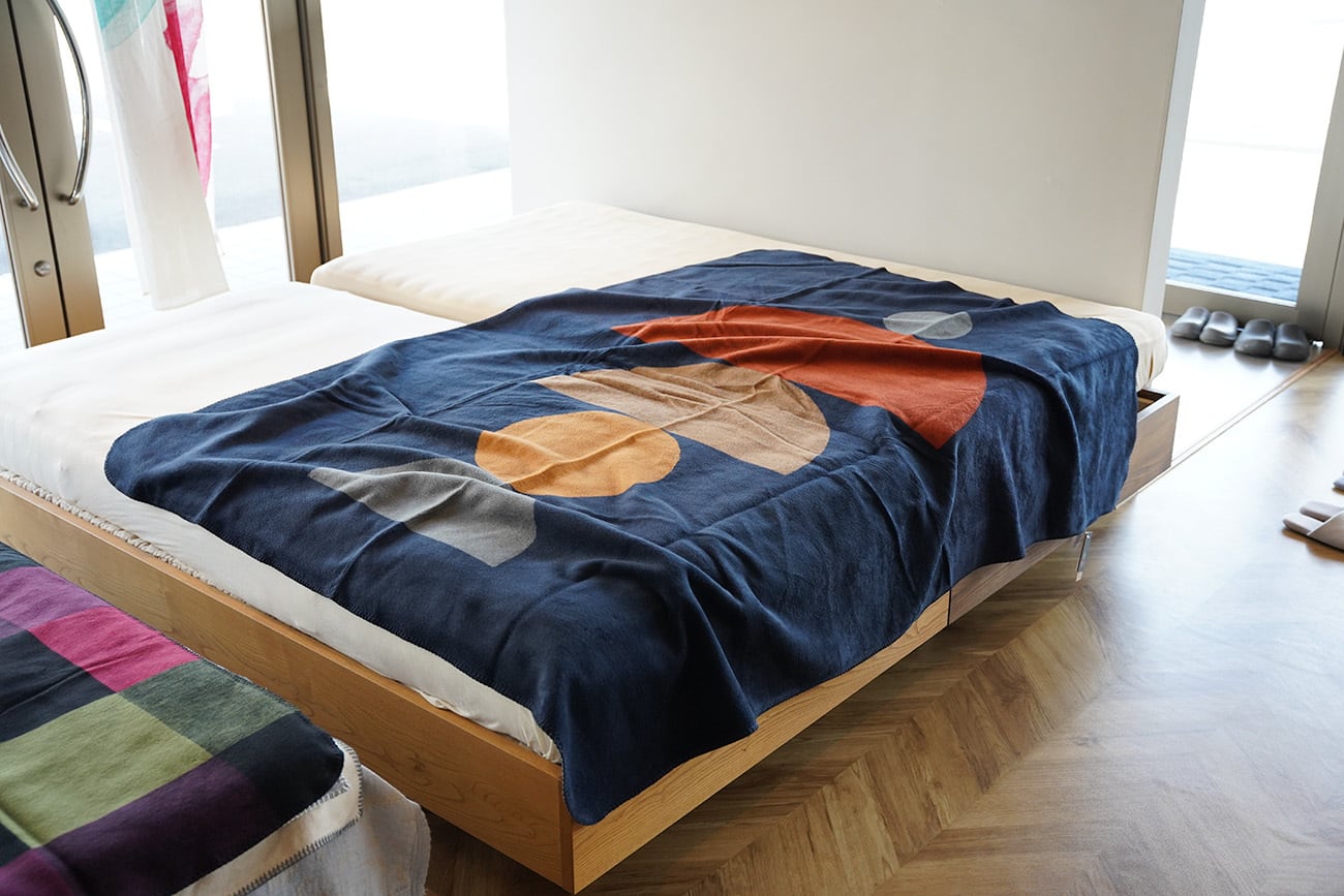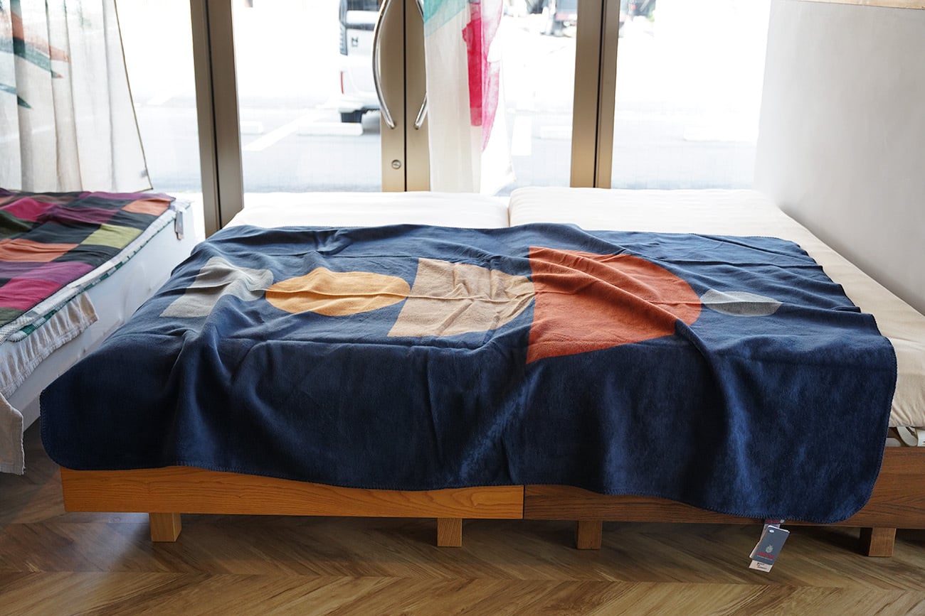 お布団の中に着ても良し、羽毛布団の上から重ねて使いながら保温性をプラスするとともにベッドスローとして活用するのもアリです。
